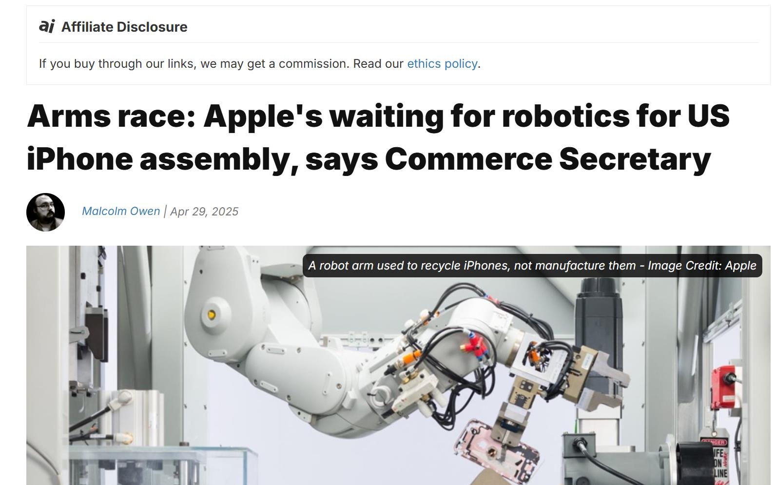 外媒认为,无论苹果最终是否使用机械臂或人工在美国制造 iPhone,这都需要相当长的时间才能实现。(青云)
