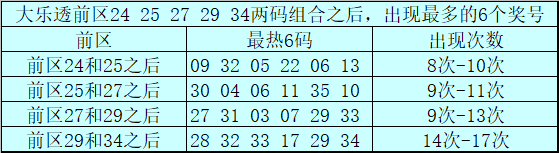 前区两码24和25和之后表现最热的6个号码为:09、32、05、22、06、13;